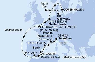 | Den 12 | Marseille, Francie, (připlutí: 08:00 | odplutí: 18:00) |