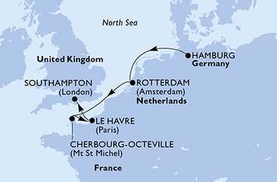 | Den 5 | Le Havre, Francie, (připlutí: 08:00 | odplutí: 21:00) |