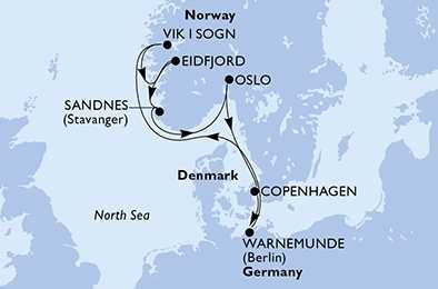 | Den 3 | Vik, Norsko, (připlutí: 09:00 | odplutí: 18:00) |