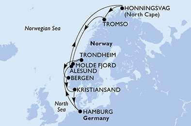 | Den 6 | Honningsvag, Mageroya, (připlutí: 00:01 | odplutí: 02:00) |
