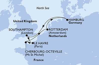 | Den 6 | Le Havre, Francie, (připlutí: 09:00 | odplutí: 20:30) |