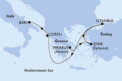 | Den 1 | Pireus (Athény), Řecko, (připlutí: --:-- | odplutí: 17:00) |