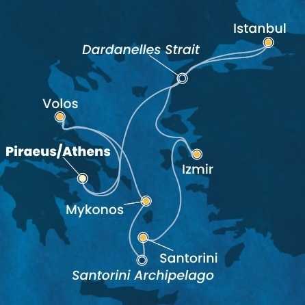 Ceny jsou pohyblivé a uvedená cena je pouze orientační. Aktuální cena bude určena v okamžiku nezávazné rezervace. Pro účast na plavbě je nutné mít cestovní pas platný ještě minimálně 6 měsíců po ukončení plavby. Pro plavby navštěvující USA musí být pas biometrický. Občané EU, kteří se zúčastní plaveb s destinacemi výhradně v Schengenském prostoru, mohou cestovat i s občanským průkazem. Pokud máte jakákoli zdravotní omezení, cestujete s kojenci nebo jste těhotná, ZDE si prosíme ověřte, že je pro Vás plavba vhodná a můžete ji absolvovat. Pokud cestujete s nezletilými dětmi, máte odlišná příjmení nebo necestují oba rodiče/zákonní zástupci, prosíme ověřte si u nás podmínky účasti. Nalodění (check-in) první den plavby se uzavírá několik hodin před plánovaným odplutím, nejpozději však 120 minut. Čas check-in bude upřesněn s palubními lístky. Doporučujeme se do přístavu dostavit s dostatečným předstihem, v případě vlastní letecké dopravy o den dříve. Cestující je sám zodpovědný za dodržení vstupních podmínek do všech navštívených zemí. Podmínky se mohou kdykoli změnit. Pořadatel má právo změnit číslo kajuty v zájmu bezpečnosti klienta v případě technických či jiných důvodů. Máte již členství u lodní společnosti? Objevte ZDE svět výhod.Od 1.7.2025 zavádí úřady poplatek za vylodění v řeckých přístavech. Výše poplatku je cca 1-20 EUR/os./den. Tento poplatek bude automaticky připsán na palubní účet cestujícího.Pokud Vaše plavba začíná v Istanbulu, po nalodění již nebude možné opustit loď. Svá zavazadla můžete v přístavu odbavit a následně pro prohlídku města využít čas před naloděním.Tyto kajuty s oknem mají zcela omezený výhled: 6201-6206, 7201-7206, 9201-9203, 1001-1004.