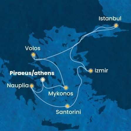 Ceny jsou pohyblivé a uvedená cena je pouze orientační. Aktuální cena bude určena v okamžiku nezávazné rezervace. Pro účast na plavbě je nutné mít cestovní pas platný ještě minimálně 6 měsíců po ukončení plavby. Pro plavby navštěvující USA musí být pas biometrický. Občané EU, kteří se zúčastní plaveb s destinacemi výhradně v Schengenském prostoru, mohou cestovat i s občanským průkazem. Pokud máte jakákoli zdravotní omezení, cestujete s kojenci nebo jste těhotná, ZDE si prosíme ověřte, že je pro Vás plavba vhodná a můžete ji absolvovat. Pokud cestujete s nezletilými dětmi, máte odlišná příjmení nebo necestují oba rodiče/zákonní zástupci, prosíme ověřte si u nás podmínky účasti. Nalodění (check-in) první den plavby se uzavírá několik hodin před plánovaným odplutím, nejpozději však 120 minut. Čas check-in bude upřesněn s palubními lístky. Doporučujeme se do přístavu dostavit s dostatečným předstihem, v případě vlastní letecké dopravy o den dříve. Cestující je sám zodpovědný za dodržení vstupních podmínek do všech navštívených zemí. Podmínky se mohou kdykoli změnit. Pořadatel má právo změnit číslo kajuty v zájmu bezpečnosti klienta v případě technických či jiných důvodů. Máte již členství u lodní společnosti? Objevte ZDE svět výhod.Od 1.7.2025 zavádí úřady poplatek za vylodění v řeckých přístavech. Výše poplatku je cca 1-20 EUR/os./den. Tento poplatek bude automaticky připsán na palubní účet cestujícího.Pokud Vaše plavba začíná v Istanbulu, po nalodění již nebude možné opustit loď. Svá zavazadla můžete v přístavu odbavit a následně pro prohlídku města využít čas před naloděním.Tyto kajuty s oknem mají omezený výhled: 6201-6206, 7201-7206, 9201-9203.