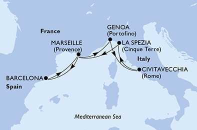 | Den 2 | Marseille, Francie, (připlutí: 07:00 | odplutí: 18:00) |