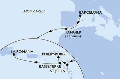 Španělsko, Maroko, Antigua a Barbuda, Svatý Martin, Svatý Kryštof a Nevis, Dominikánská republika z Barcelony na lodi MSC Opera
