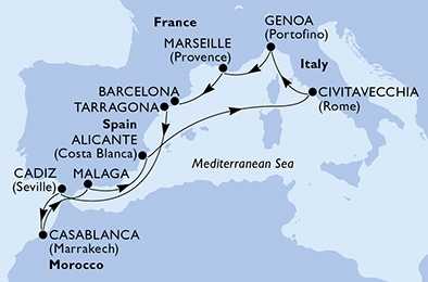 | Den 4 | Casablanca, Maroko, (připlutí: 06:00 | odplutí: 20:00) |
