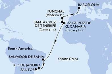 | Den 17 | Santos, Brazílie, (připlutí: 06:00 | odplutí: --:--) |