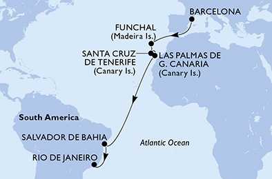| Den 13 | Salvador, Brazílie, (připlutí: 08:00 | odplutí: 18:00) |
