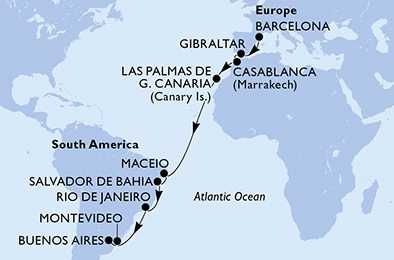 | Den 13 | Salvador, Brazílie, (připlutí: 10:00 | odplutí: 19:00) |