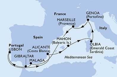Španělsko, Velká Británie, Portugalsko, Itálie, Francie z Málagy na lodi MSC Opera