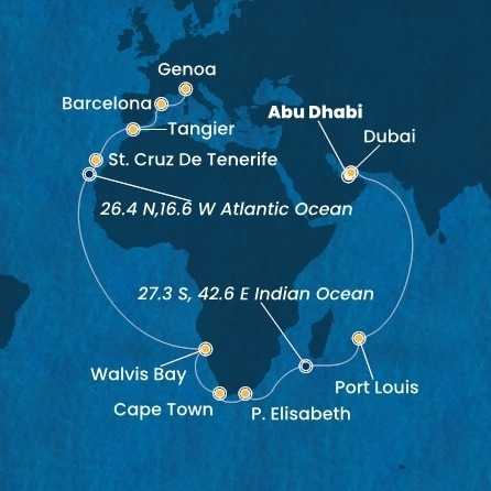 Spojené arabské emiráty, Mauricius, Jihoafrická republika, Namibie, Španělsko, Maroko, Itálie z Abu Dhabi na lodi Costa Smeralda