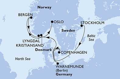 | Den 8 | Lyngdal, Norsko, (připlutí: 09:00 | odplutí: 18:00) |