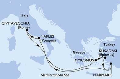 Trasa plavby program Den 1 Kusadasi (Efez), Turecko, (připlutí: --:-- | odplutí: 18:00) Den 2 Marmaris, Turecko, (připlutí: 07:00 | odplutí: 17:00) Den 3 Relaxační den na moři Den 4 Neapol, Itálie, (připlutí: 11:00 | odplutí: 20:00) Den 5 Civitavecchia, Itálie, (připlutí: 07:00 | odplutí: 17:00) Den 6 Relaxační den na moři Den 7 Mykonos, Řecko, (připlutí: 14:00 | odplutí: 23:30) Den 8 Kusadasi (Efez), Turecko, (připlutí: 09:00 | odplutí: --:--)