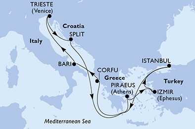 | Den 9 | Izmir (Efez), Turecko, (připlutí: 08:00 | odplutí: 17:00) |