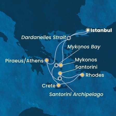 Máte již členství u lodní společnosti? Objevte ZDE svět výhod.Pokud Vaše plavba začíná v Istanbulu, po nalodění již nebude možné opustit loď. Svá zavazadla můžete v přístavu odbavit a následně pro prohlídku města využít čas před naloděním.Od 1.7.2025 zavádí úřady poplatek za vylodění v řeckých přístavech. Výše poplatku je cca 1-20 EUR/os./den. Tento poplatek bude automaticky připsán na palubní účet cestujícího.Tyto kajuty s oknem mají zcela omezený výhled: 6201-6206, 7201-7206, 9201-9203, 1001-1004.