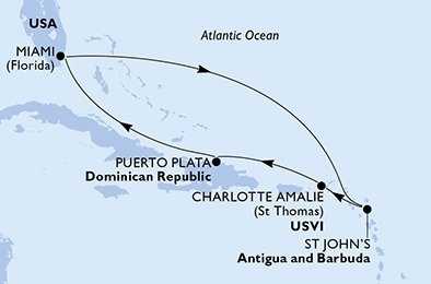 | Den 4 | St. John, Antigua a Barbuda, (připlutí: 09:00 | odplutí: 18:00) |