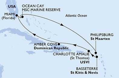 | Den 2 | Ocean Cay MSC Marine Reserve, Ocean Cay, (připlutí: 08:00 | odplutí: 16:30) |