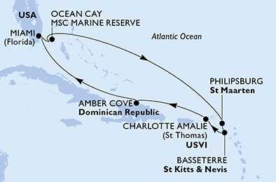 | Den 2 | Ocean Cay MSC Marine Reserve, Ocean Cay, (připlutí: 08:00 | odplutí: 16:30) |