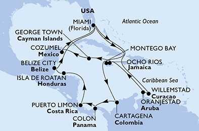 USA, Curacao, Aruba, Jamajka, Kajmanské ostrovy, Mexiko, Kolumbie, Panama, Kostarika, Honduras, Belize z Miami na lodi MSC Poesia, plavba s bonusem