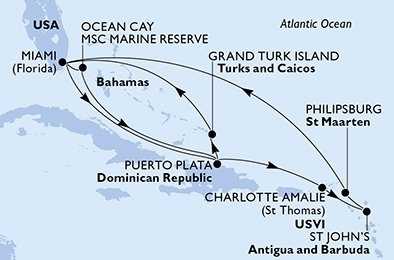| Den 10 | Ocean Cay MSC Marine Reserve, Ocean Cay, (připlutí: 08:00 | odplutí: 23:59) |