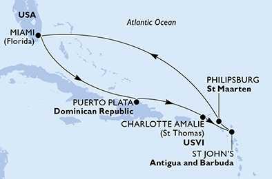 | Den 4 | Charlotte Amalie, Americké Panenské ostrovy, (připlutí: 11:00 | odplutí: 21:00) |