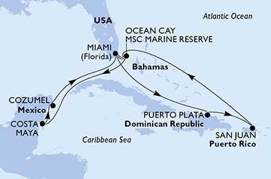 | Den 9 | Ocean Cay MSC Marine Reserve, Ocean Cay, (připlutí: 08:00 | odplutí: 18:00) |