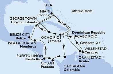 USA, Curacao, Bonaire, Aruba, Dominikánská republika, Jamajka, Kolumbie, Panama, Kostarika, Honduras, Belize z Miami na lodi MSC Poesia, plavba s bonusem