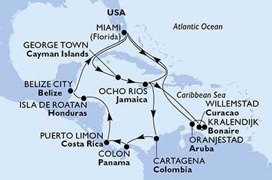 USA, Kajmanské ostrovy, Jamajka, Curacao, Bonaire, Aruba, Kolumbie, Panama, Kostarika, Honduras, Belize z Miami na lodi MSC Poesia