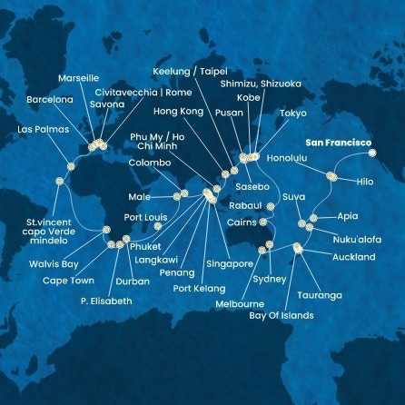 Ceny jsou pohyblivé a uvedená cena je pouze orientační. Aktuální cena bude určena v okamžiku nezávazné rezervace. Pro účast na plavbě je nutné mít cestovní pas platný ještě minimálně 6 měsíců po ukončení plavby. Pro plavby navštěvující USA musí být pas biometrický. Občané EU, kteří se zúčastní plaveb s destinacemi výhradně v Schengenském prostoru, mohou cestovat i s občanským průkazem. Pokud máte jakákoli zdravotní omezení, cestujete s kojenci nebo jste těhotná, ZDE si prosíme ověřte, že je pro Vás plavba vhodná a můžete ji absolvovat. Pokud cestujete s nezletilými dětmi, máte odlišná příjmení nebo necestují oba rodiče/zákonní zástupci, prosíme ověřte si u nás podmínky účasti. Nalodění (check-in) první den plavby se uzavírá několik hodin před plánovaným odplutím, nejpozději však 120 minut. Čas check-in bude upřesněn s palubními lístky. Doporučujeme se do přístavu dostavit s dostatečným předstihem, v případě vlastní letecké dopravy o den dříve. Cestující je sám zodpovědný za dodržení vstupních podmínek do všech navštívených zemí. Podmínky se mohou kdykoli změnit. Pořadatel má právo změnit číslo kajuty v zájmu bezpečnosti klienta v případě technických či jiných důvodů. Máte již členství u lodní společnosti? Objevte ZDE svět výhod.Pro vstup na území USA musíte mít schválenou registraci ESTA anebo vízum. Registraci ESTA je možné provést online ZDE, cena je cca 40 USD/osoba. Registraci lze provést i skrze mobilní aplikaci (QR kód ke stažení aplikace se zobrazí po otevření odkazu viz výše). Na plavbách, které navštěvují USA je legální věk pro konzumaci alkoholu 21 let.Pro vstup na území USA musíte mít schválenou registraci ESTA anebo vízum. Registraci ESTA je možné provést online ZDE, cena je cca 40 USD/osoba. Registraci lze provést i skrze mobilní aplikaci (QR kód ke stažení aplikace se zobrazí po otevření odkazu viz výše).Na plavbách, které navštěvují USA je legální věk pro konzumaci alkoholu 21let.Pro vstup na území Nového Zélandu musíte mít schválenou registraci NZeTA. Registraci NZeTA je možné provést online na odkazu ZDE, cena je cca 123 NZD/osoba. V ceně je započítán poplatek za mezinárodní ochranu a cestovní ruch (International Visitor Conservation and Tourism Levy), který je povinný. Pro vstup na území Austrálie musíte mít vízum. Pro turistické cesty do 90 dnů stačí eVisitor (651), které je zdarma. O vízum můžete zažádat online na odkazu ZDE.Pro vstup na území Papuy Nové Guiney je zapotřebí vízum. Pro krátkodobý pobyt stačí evízum (Visitor), které se dělá online ZDE, jeho cena je 50 USD. Některé lodní společnosti zajišťují vízum na palubě, obraťte se na nás pro více informací.U plaveb, které vyplouvají z Japonska, se účtuje přístavní poplatek cca 6 USD/osoba.Před vstupem do Jižní Koreje je potřeba vyplnit příjezdový formulář tzv. arrival card na odkazu ZDE, který je bezplatný.Pro vstup na území Číny je vyžadováno vízum. Pro jeho získání je nutné navštívit vízové centrum v Praze, cena je cca 2 200 Kč. Některá města spadají pod 240 h bezvízový vstupní tranzit, podrobnosti najdete zde. Na území Hong Kongu a Macaa platí bezvízový styk pro turistické cesty do délky 90 dní (pokud se z Hong Kongu vracíte zpět do pevninské Číny, je v takovém případě potřeba dvouvstupé vízum). Na plavbách které navštěvují Čínu je legální věk pro konzumaci alkoholu 21let. Pro vstup do Vietnamu od 15.8.2025 do 14.8.2028 dochází k zavedení bezvízového režimu. Pro vstup do Thajska je potřeba vyplnit digitální příjezdovou kartu TDAC na odkazu zde. Pro vstup na území Srí Lanky musíte obdržet bezplatnou elektronickou cestovní autorizaci, tzv. ETA (Electronic Travel Authorization) Transit visa, a to online na odkazu ZDE. Pro vstup do Namibie je potřeba evízum, které se dělá online na odkazu ZDE, cena je cca 70 EUR. Některé lodní společnosti zajišťují vízum na palubě, obraťte se na nás pro více informací.Pokud Vaše plavba začíná na Kapverdách, je potřeba vyplnit online registraci na odkazu zde https://www.ease.gov.cv/, poplatek je 31 EUR.Všechny kajuty s oknem na 4. palubě mají zcela omezený výhled. Kajuty s oknem na 6. a 7. palubě mají částečně omezený výhled.