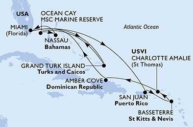 USA, Svatý Kryštof a Nevis, Dominikánská republika, Zámořské území Velké Británie, Bahamy z Miami na lodi MSC Meraviglia, plavba s bonusem