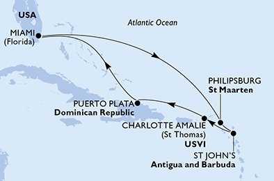 | Den 7 | Puerto Plata, Dominikánská republika, (připlutí: 10:00 | odplutí: 18:00) |