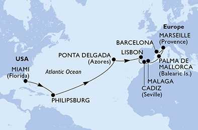 | Den 17 | Marseille, Francie, (připlutí: 13:00 | odplutí: 19:00) |