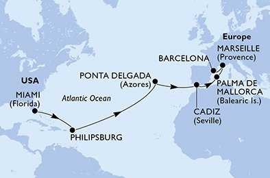 | Den 16 | Marseille, Francie, (připlutí: 10:00 | odplutí: 18:00) |