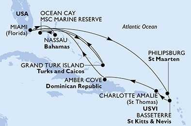USA, Svatý Martin, Svatý Kryštof a Nevis, Dominikánská republika, Bahamy, Zámořské území Velké Británie z Miami na lodi MSC Meraviglia, plavba s bonusem