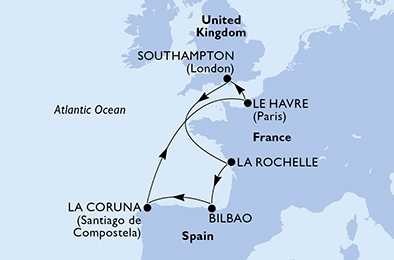 | Den 7 | Le Havre, Francie, (připlutí: 08:00 | odplutí: 22:00) |