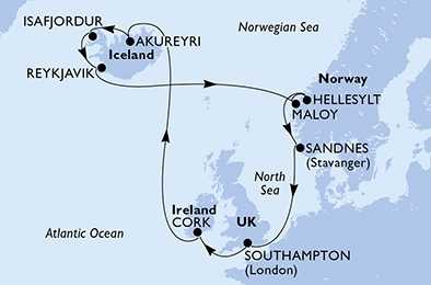 | Den 11 | Maloy, Norsko, (připlutí: 11:00 | odplutí: 20:00) |