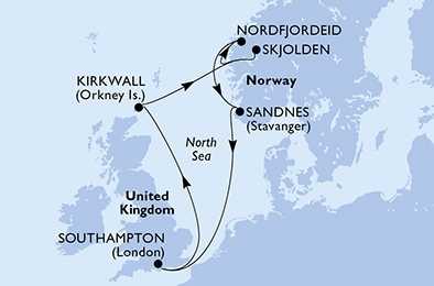 | Den 5 | Nordfjordeid, Norsko, (připlutí: 10:00 | odplutí: 18:00) |