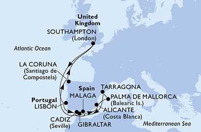 | Den 11 | Gibraltar, Velká Británie, (připlutí: 08:00 | odplutí: 18:00) |
