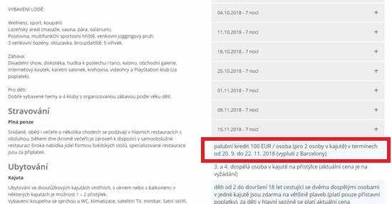 Při rozkliknuté každé plavby, se musí pod termíny s cenami zobrazit následující věta o palubním kreditu. Výše kreditu, termíny a přístav vyplutí je samozřejmě pouze ukázkový.